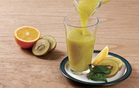 Thành phần: Cam 240g, Kiwi 40g, 4 lá húng quế.
