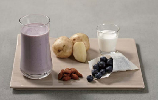 Thành phần: Dâu xanh 120g, sữa 300ml, quả hạnh nhân 20g, khoai tây đã luộc 100g.